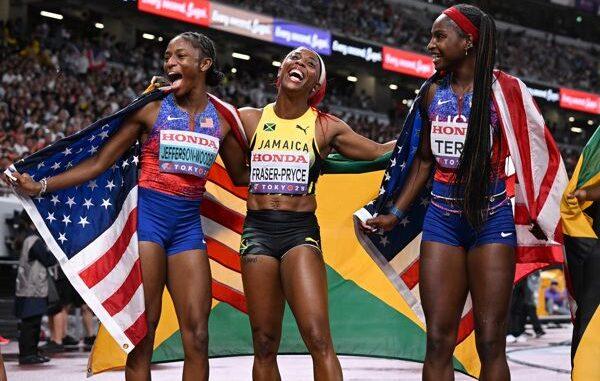 USA’s Melissa Jefferson-Wooden became only the second female sprinter after Shelly-Ann Fraser-Pryce to complete the sprint treble – receiving a baton of sorts from the Jamaican sprint superstar who made her World Championships farewell in Tokyo.