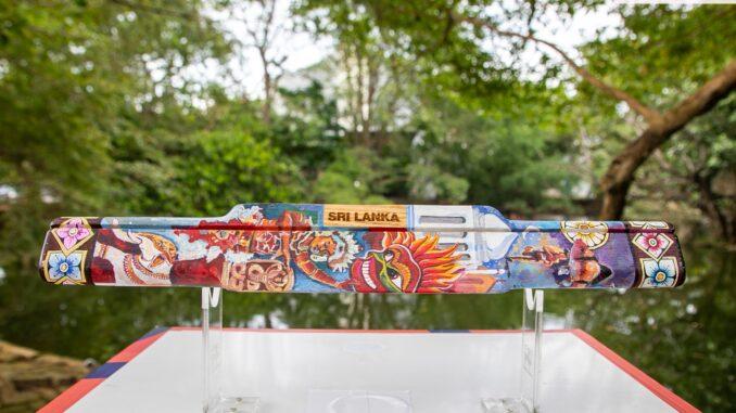 This side of the King’s Baton of Sri Lanka for the Glasgow 2026 Commonwealth Games, engraved with “Sri Lanka”, brings together a Kandyan dancer, a ceremonially adorned elephant, the Naipena guardstone, a traditional mask, the endemic freshwater fish Bandula Pethiya, an athlete in motion, a mosque and a church, representing unity in diversity.