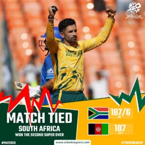 In the second Super Over, Miller and Stubbs went fearless, smashing 23 runs. Afghanistan needed 24 to win. Gurbaz tried his best, but Maharaj took 2 wickets and restricted them to 19.