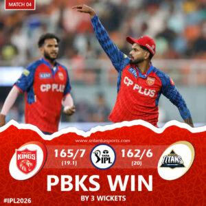 Gujarat Titans batted first and scored 162 for 6 in 20 overs. Shubman Gill played a good knock of 39 runs, while Jos Buttler added 38. Glenn Phillips also helped with 25 runs. For Punjab, Vijaykumar Vyshak took 3 wickets, and Yuzvendra Chahal picked up 2 wickets to control the game.